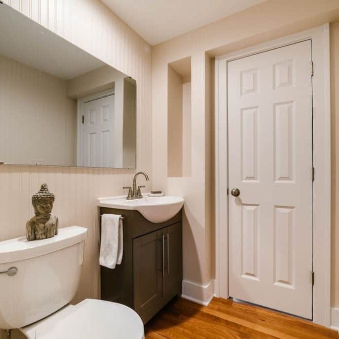 We were invited to add a powder room in this Sycamore, Illinois home. This photo shows the addition to the main floor to better accommodate the family’s guests. After removing an existing hallway closet, we installed a wall to create a half bath with a toilet and sink. We also replaced the vinyl flooring with 2 ¼” oak hardwood floors and extended this flooring into the kitchen. Design touches including a wall niche and beadboard walls were added.